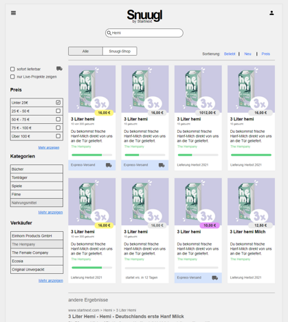 Ein Beispiel: Wenn du „Milch+Hanf“ suchst, findest du Hanf- oder Hafermilch und kannst sie direkt bestellen, sofern das Crowdfunding gerade läuft und die Schlüsselworte im Dankeschön-Text benutzt worden sind. https://www.startnext.com/snuugl#/?search=milch%2Bhanf&tab=0&fundable=0
