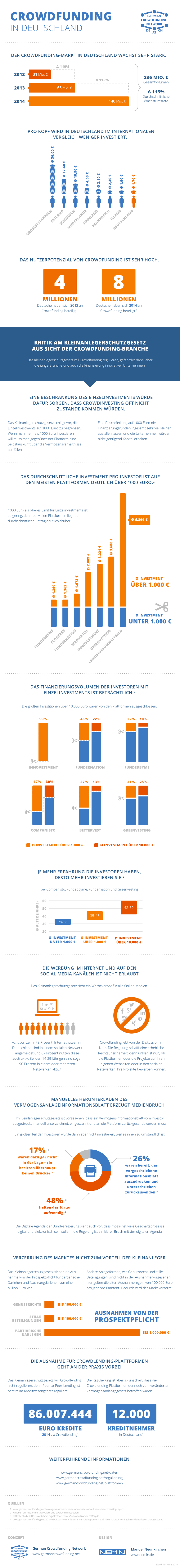 Aktuell wird das Kleinanlegerschutzgesetz im Bundestag diskutiert, das auch Auswirkungen auf das Thema Crowdinvesting hätte. Anlässlich der Debatte hat das German Crowdfunding Network eine interessante Infografik erstellt, in der die Entwicklung von Crowdfunding in Deutschland und die wichtigsten Kritikpunkte am Kleinanlegerschutzgesetz zusammengefasst werden.