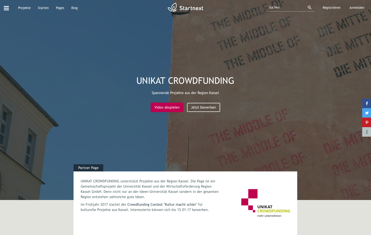 Die Universität Kassel präsentiert auf ihrer Page Projekte und Startups aus der Hochschule und der gesamten Stadt. Dabei begleitet das UNIKAT-Team die Starter persönlich von der Planung des Crowdfunding-Projekts über die Durchführung bis hin zur Kommunikation. Die Page UNIKAT ist ein Gemeinschaftsprojekt zwischen dem UniKasselTransfer Inkubator, der Wirtschaftsförderung Region Kassel und der Universität Kassel.