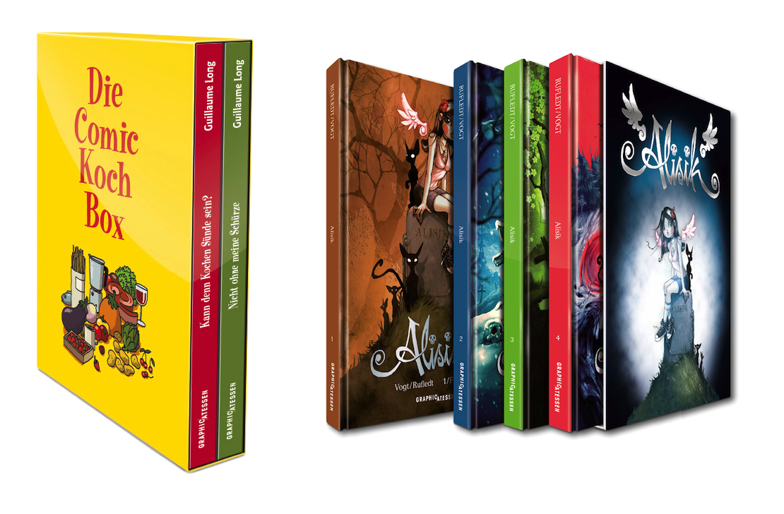 Sechs exklusive Titel sind derzeit geplant, welche nach und nach über die Page Graphic/atessen bekanntgegeben werden. Die Crowdfunding Page auf Startnext ist hierbei ein ideales Mittel für den Verlag, sich und sein Vorhaben öffentlich vorzustellen und die Buch-Projekte zu kommunizieren. Den Auftakt bilden die Neuausgabe im hochwertigen Schuber „Alisiks wunderbare Welt“ von Hubertus Rufledt und Helge Vogt sowie die „Comic-Koch-Box deluxe“ des französischen Food-Bloggers Guillaume Long.
