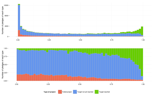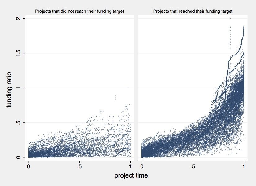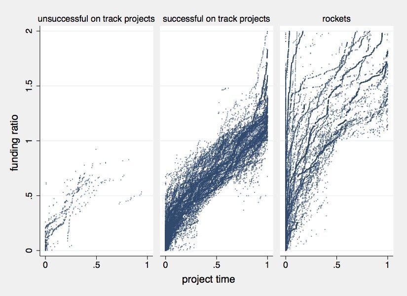 Die Wissenschaftler haben sich mit der Frage beschäftigt, ob man schon frühzeitig während einer Kampagne voraussehen kann, ob ein Projekt erfolgreich finanziert wird oder nicht. Für ca. 30% der Projekte trifft das zu: Zu Beginn der Kampagne gewinnen sie viele Unterstützer und halten die Dynamik bis zum Erreichen des Fundingziels. Manche schaffen es sogar, vorzeitig erfolgreich finanziert zu werden (sh. Grafik 1 Rockets). Ungefähr 25% der Projekte bekommen nur sehr wenige Unterstützer und scheitern, da die Idee oder die Kommunikation von Anfang an nicht funktioniert. Bei 45% der Projekte ist in der Finanzierungsphase lange unklar, ob sie erfolgreich finanziert werden oder nicht. Ungefähr die Hälfte dieser Projekte schafft es aber, durch den Endspurt das Fundingziel doch noch zu erreichen, das heißt die Dynamik entsteht erst relativ spät in der Finanzierungsphase (sh. Grafik 2).