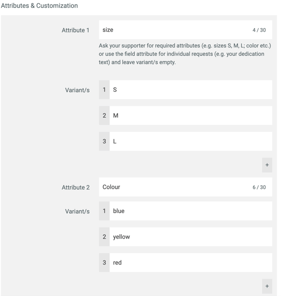 An example: You offer a t-shirt as a reward. Now create the size as the 1st attribute and query the individual variants. As 2nd attribute you can query e.g. the color.