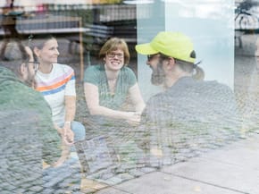 Teambesprechung im Dresdner Büro, Foto im Wintergarten von außen